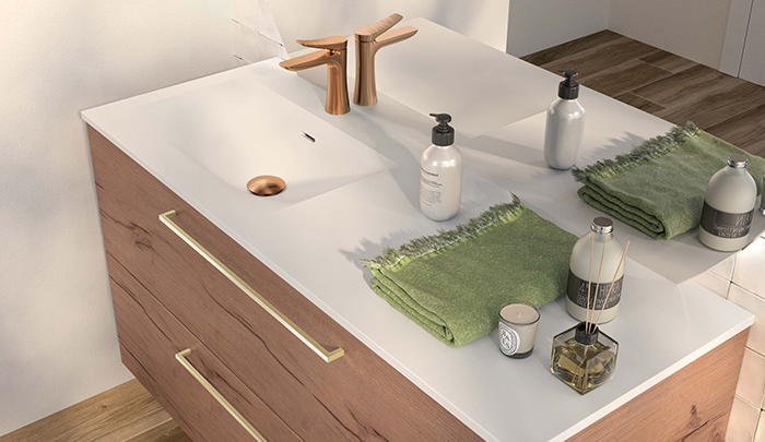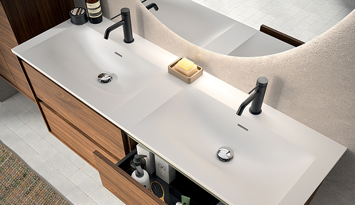 Extenso, c’est la collection de meubles de salle de bain sur-mesure. Avec des plans vasque sur mesure en marbre reconstitué brillant, Natura (11 décors), en solid surface mat ou en grès cérame (6 décors), le modèle Extenso s’adapte à tous les espaces.